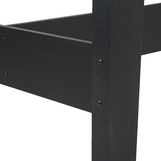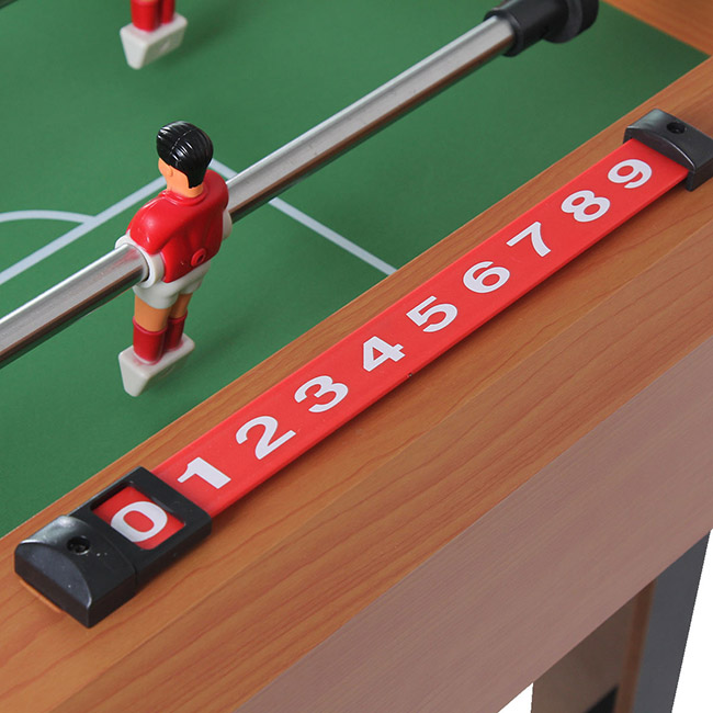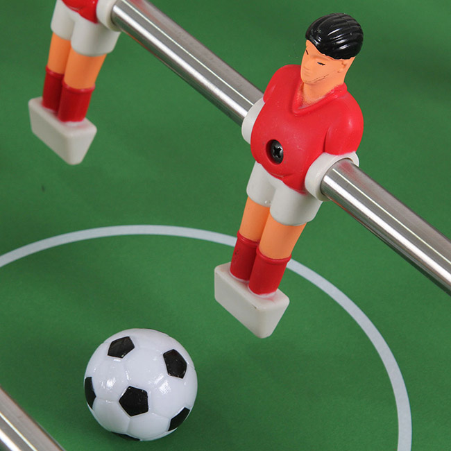 Estructura de MDF Barra de jugadores de acero inoxidable Mango de las barras de ABS Jugadores de ABS Incluye 2 pelotas de ABS Contador de goles sobre cada arco Medidas: 121 cm × 61 cm × 79 cm